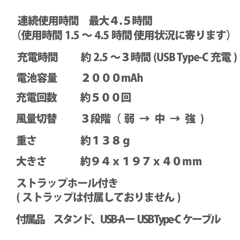 電池容量2000mAhバッテリー内蔵。充電時間は2.5〜3時間で、暑い夏の外出時に便利。