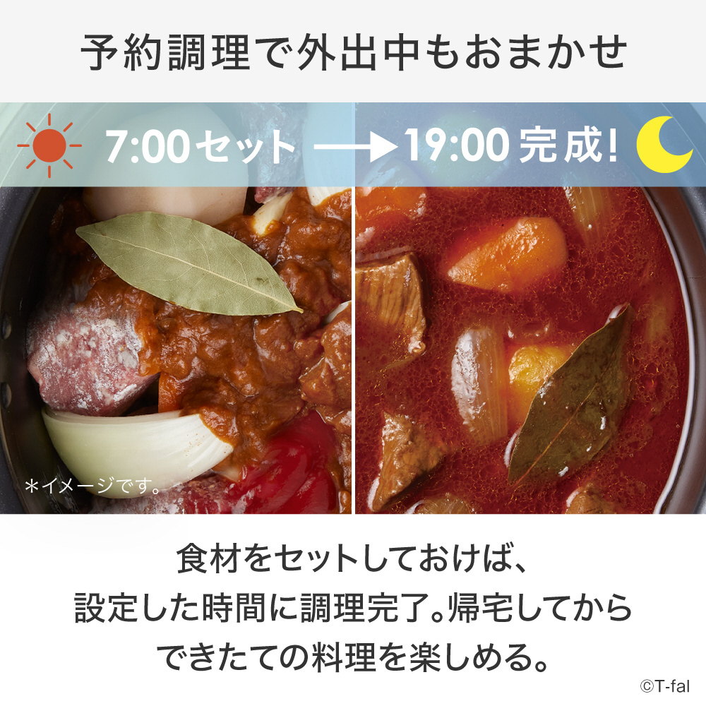 ■スマート予約調理で外出中もおまかせ 予約開始後すぐに調理を行い、最適な温度を保ちながら、最後に仕上げ加熱を行う「スマート予約調理プログラム」が付いて、お出かけ前に準備しておくと帰宅時にアツアツの出来立てが食べれます。