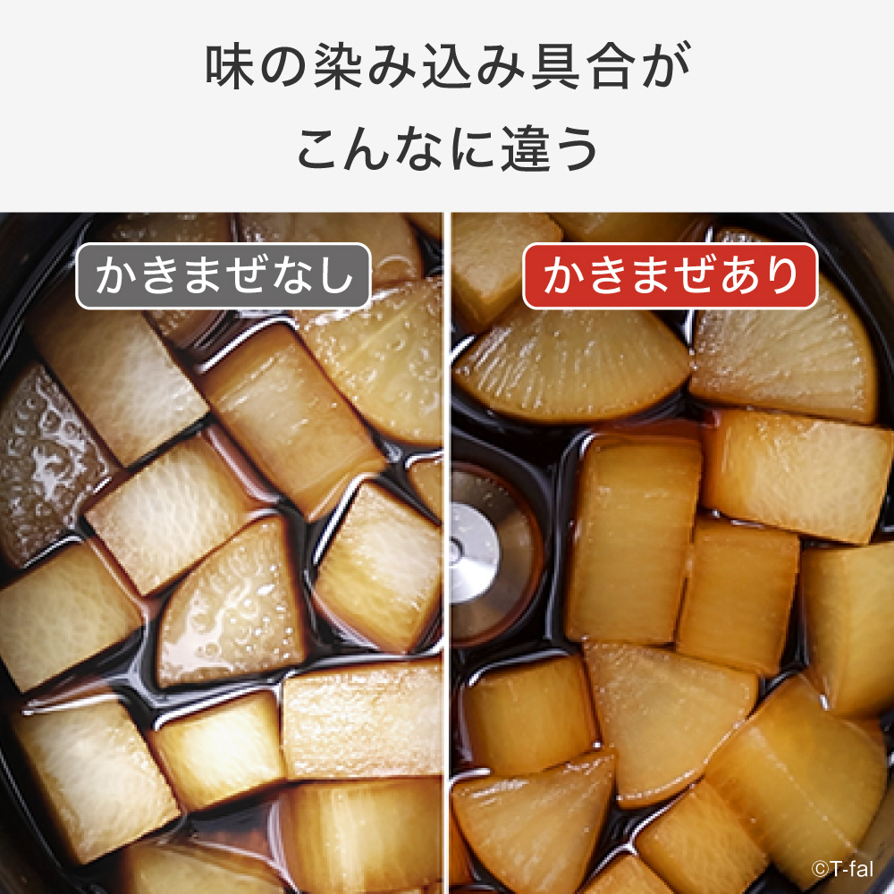 かきまぜパドルで、幅広い料理をお任せ調理。圧力調理中もかき混ぜることができるので、煮込み料理はさらにおいしく、ポテトサラダは加熱からつぶすまで6分でできます。