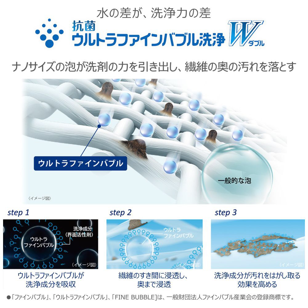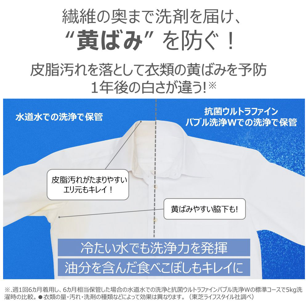 抗菌ウルトラファインバブル洗浄Wで繊維の奥から汚れを落として、黄ばみを防ぐ。