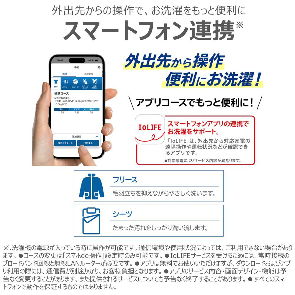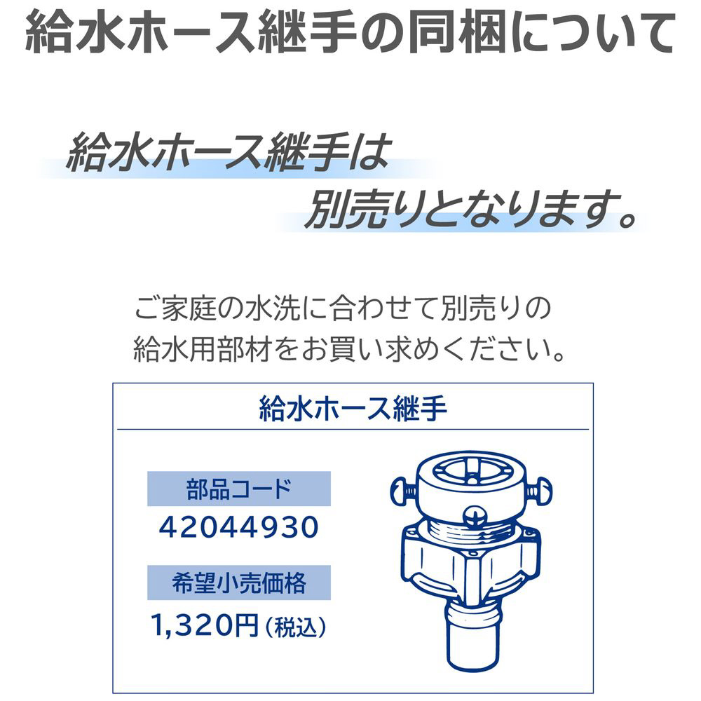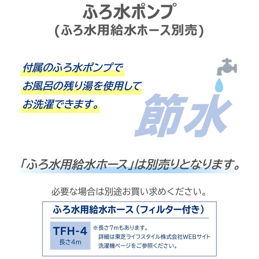 室温・水温、水道水圧、設置・排水条件、衣類の量や種類、衣類の片寄り、風呂水の使用などにより、使用水量・消費電力量・運転時間が増減します。