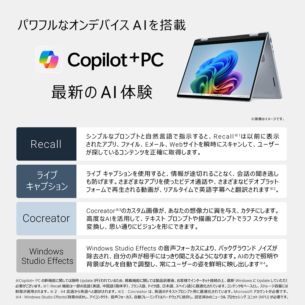 Windows 11 Home ※Copilot+PCの新機能に関しては随時Updateが行われているため、掲載機能に関しては製品到着後、お客様でインターネット接続の上、最新Windows にUpdateしていただく必要がございます。