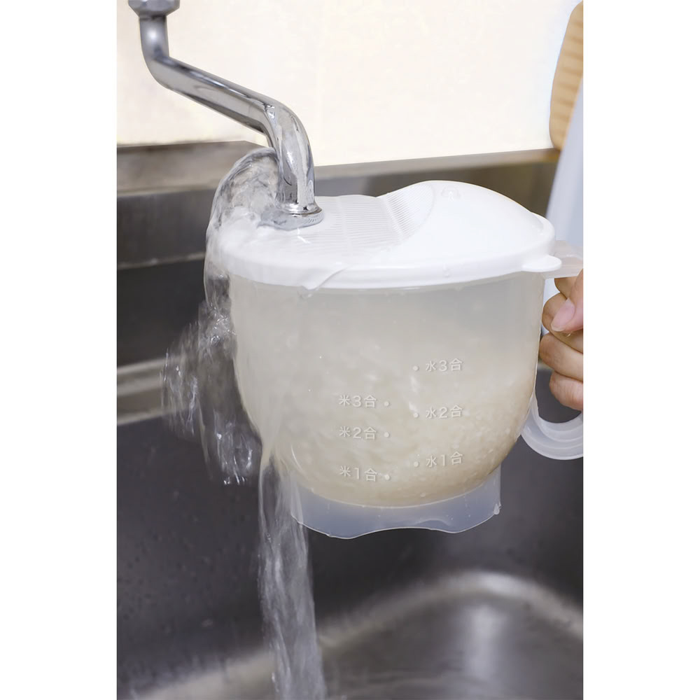 容器にお米を入れてフタをして、水道の蛇口から水を勢いよく注ぎ入れると、水流でお米が回転し、洗えるようになっています。