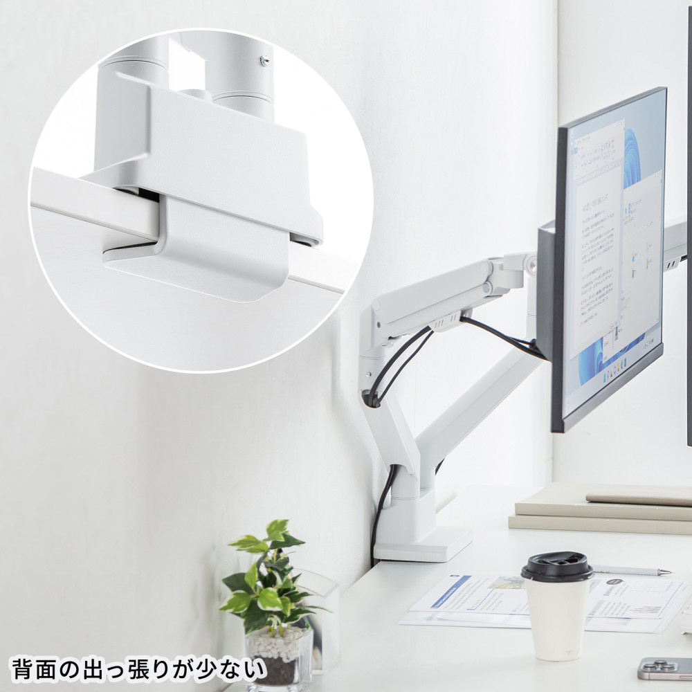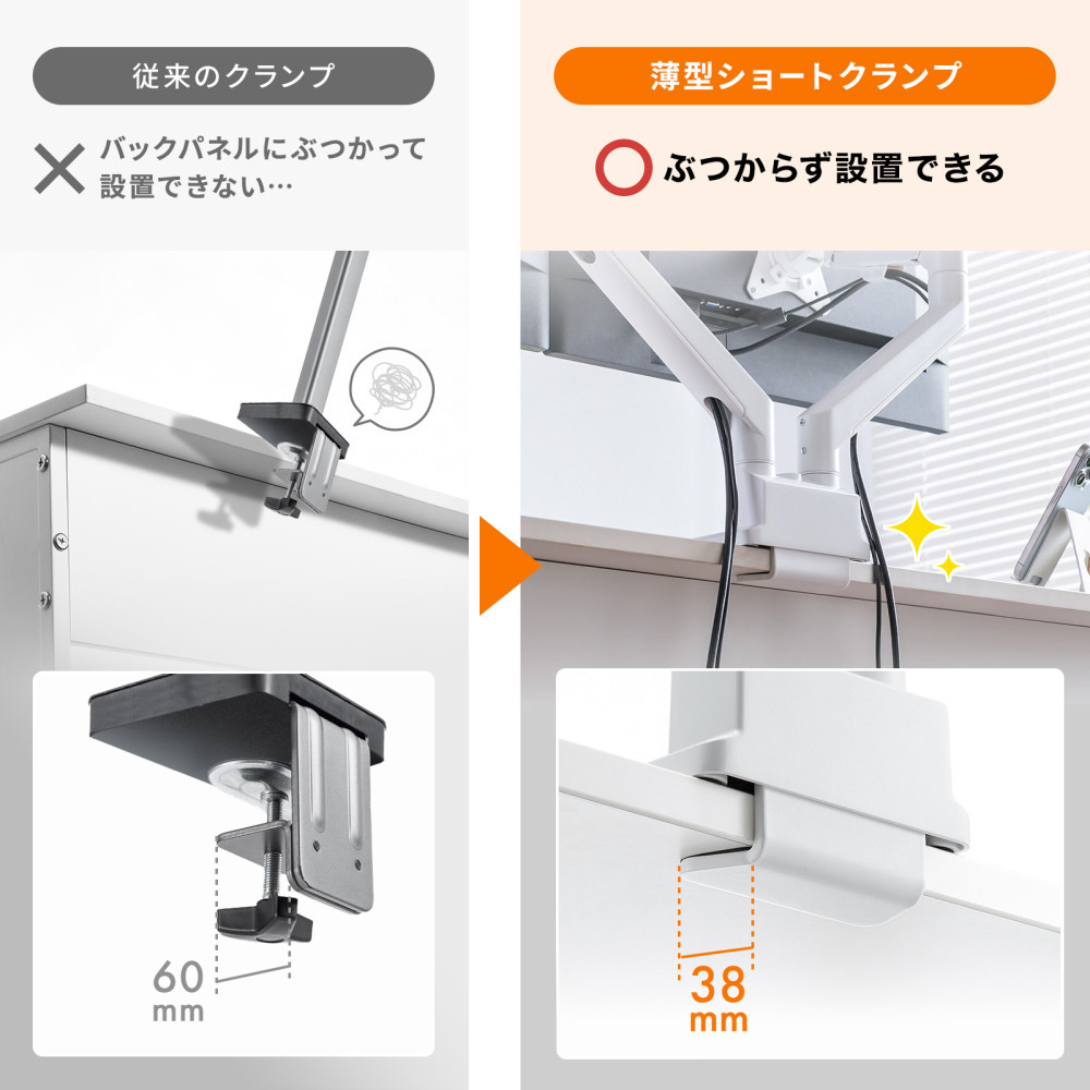 ■クランプ金具の奥行きがわずか38mmの薄型ショートクランプタイプなので、バックパネルのあるデスクにも取り付けしやすくなっています。