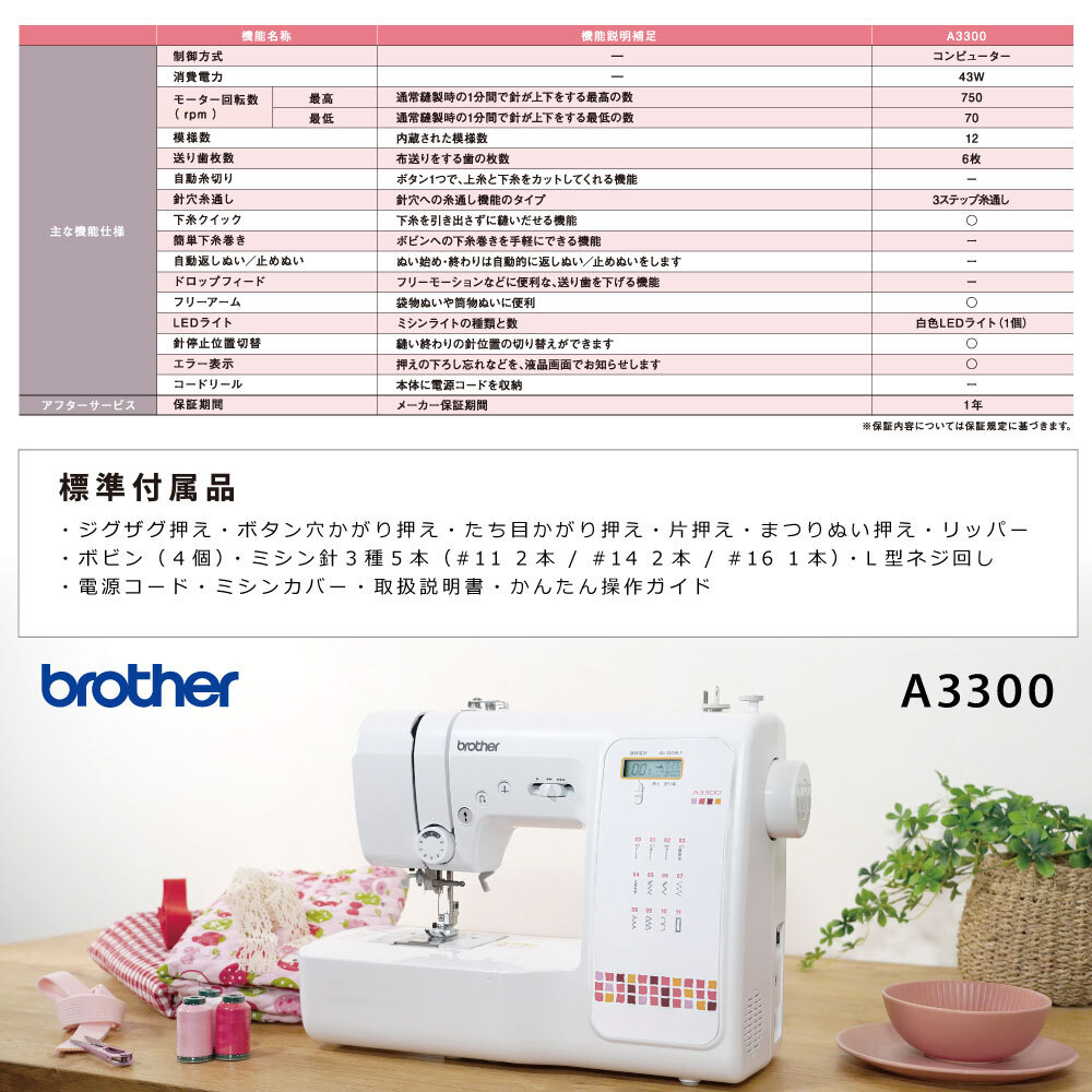 ジグザグ押え(本体に装着)・ボタン穴かがり押え・たち目かがり押え・片押え・まつりぬい押え・リッパー・取扱説明書・かんたん操作ガイド・ボビン・L型ネジ回し・針・ソフトカバー・電源コード
