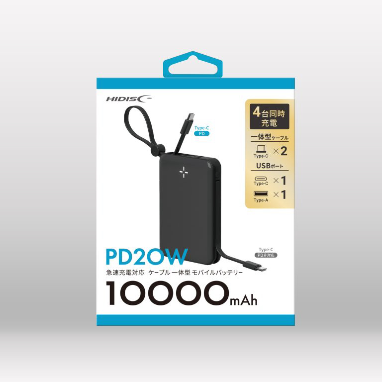 HIDISC PD20W急速充電対応 ケーブル一体型モバイルバッテリー ブラック HD4-MBTC10W2CPD20BK [USB Power Delivery対応 /4ポート]