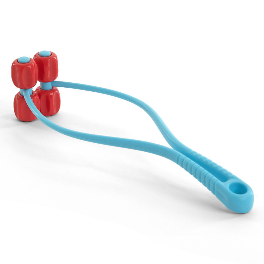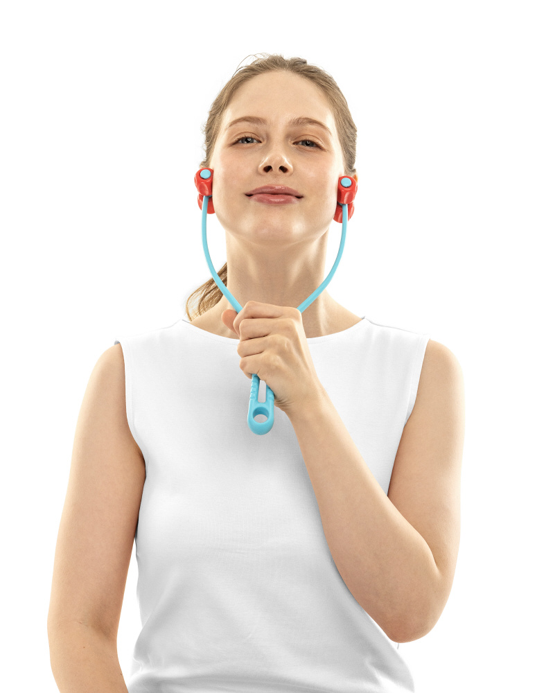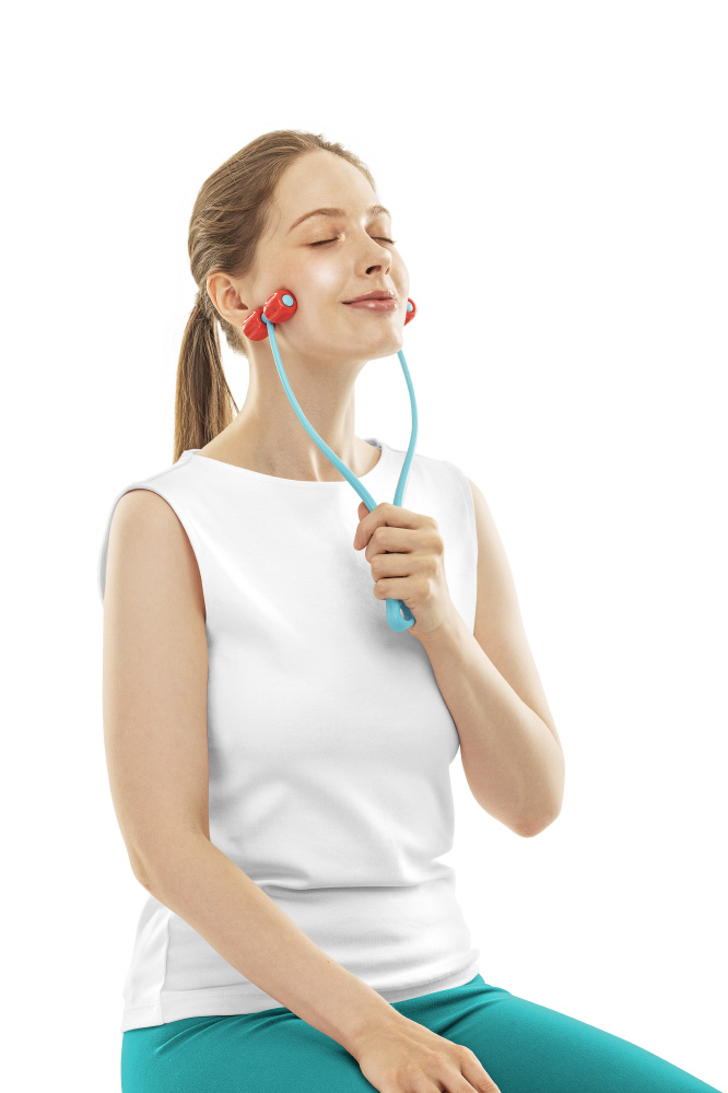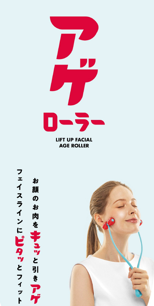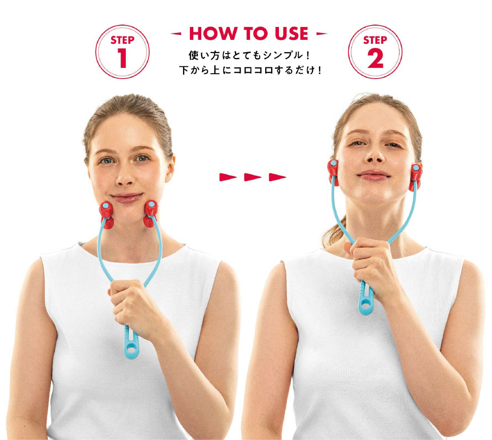 商品を手に持って、ローラーを広げて両頬に挟みます。上下にコロコロ ローリングマッサージ