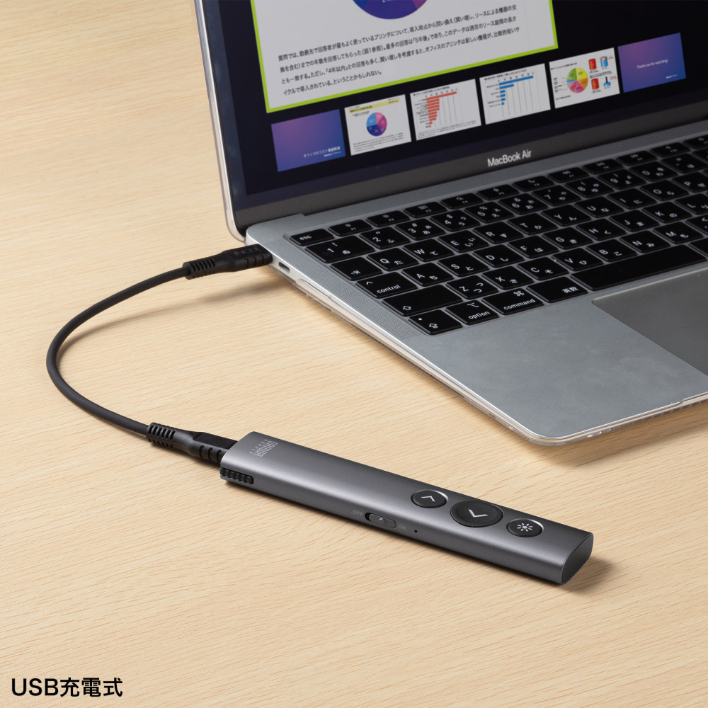 マウス操作機能付き、ワイヤレスプレゼンター。変換アダプタ付きでHDMI出力、PD急速充電が可能。USB充電式。レシーバーは本体へ収納可能。