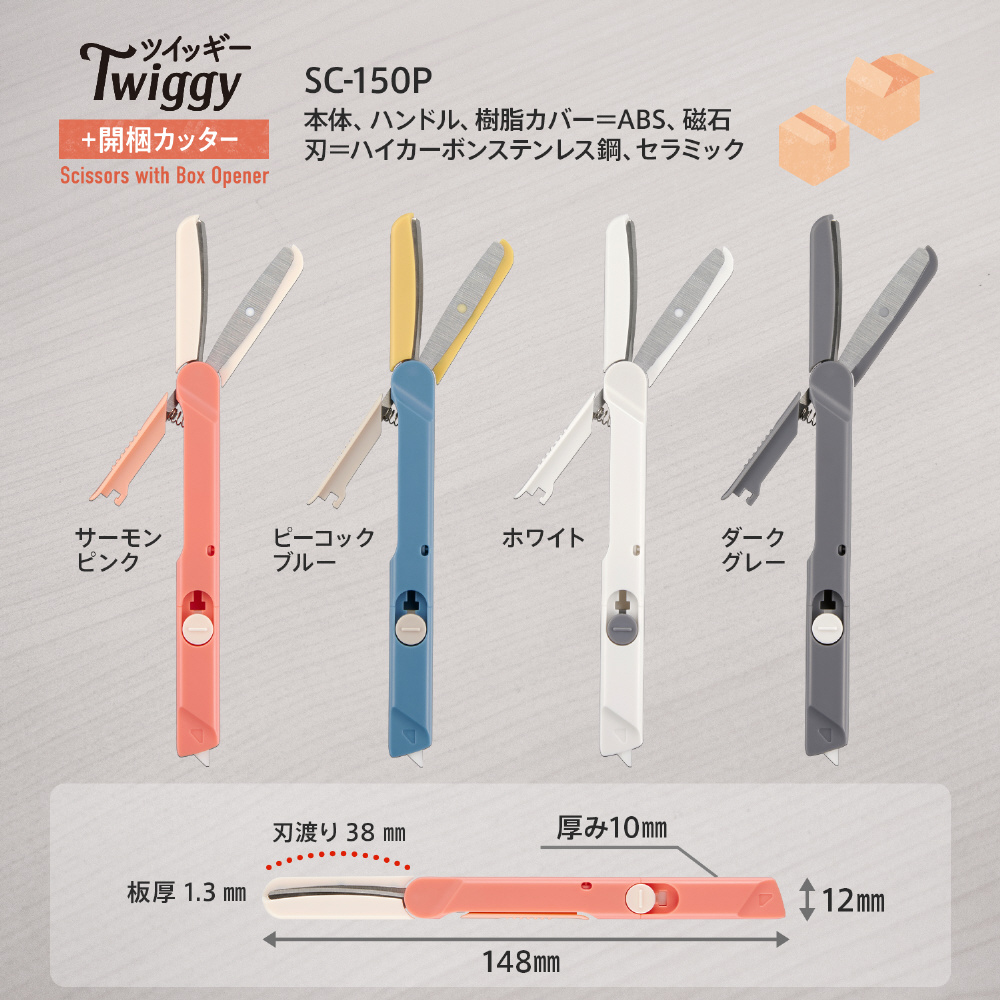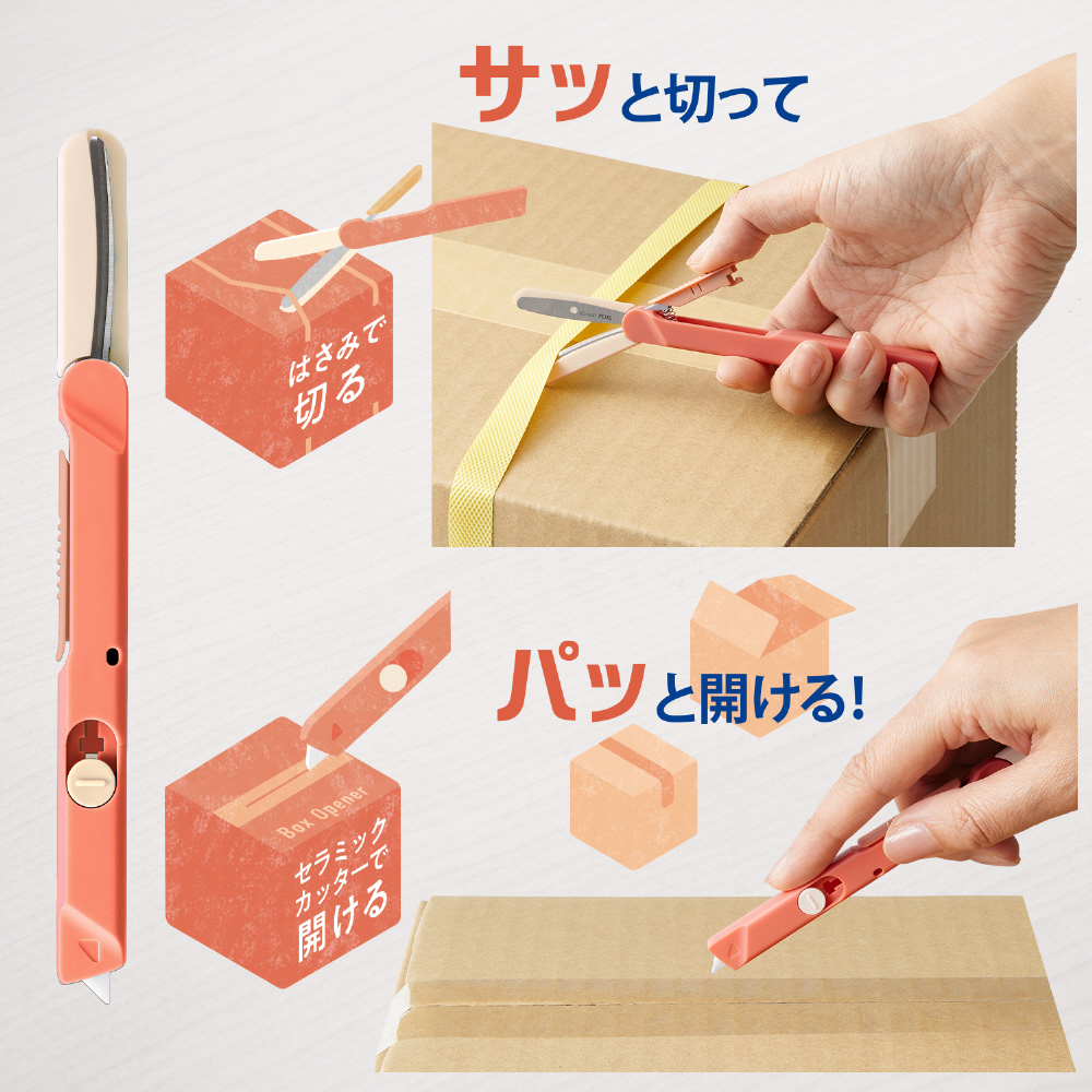 「フィットカットカーブ ツイッギー+開梱カッター」は、家庭用はさみのブランド「フィットカットカーブ」シリーズから誕生した「フィットカットカーブ ツイッギー」に、セラミック製の開梱カッターをプラス。はさみとカッターそれぞれの特性を生かして開梱・開封のあらゆるシーンに1本で対応し、梱包テープや封筒、袋、タグ、PPバンド、フィルムなどさまざまな素材をスムーズに切ることができます。