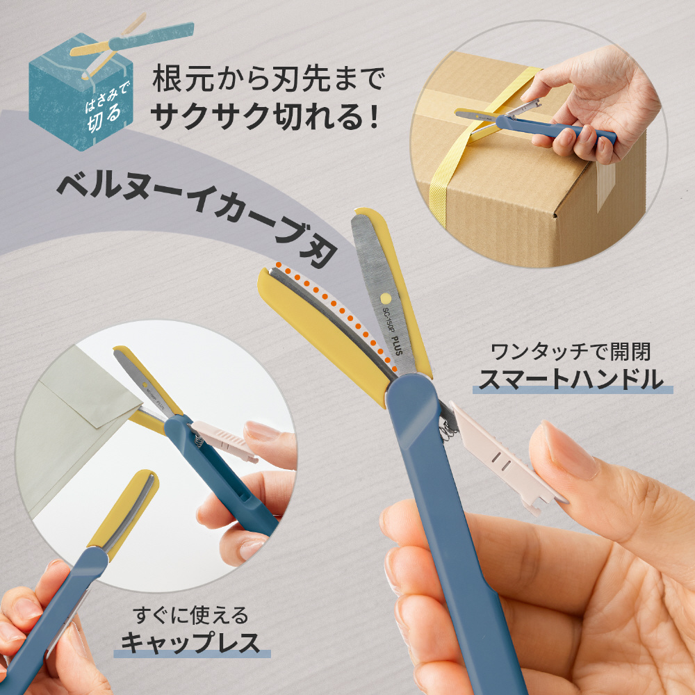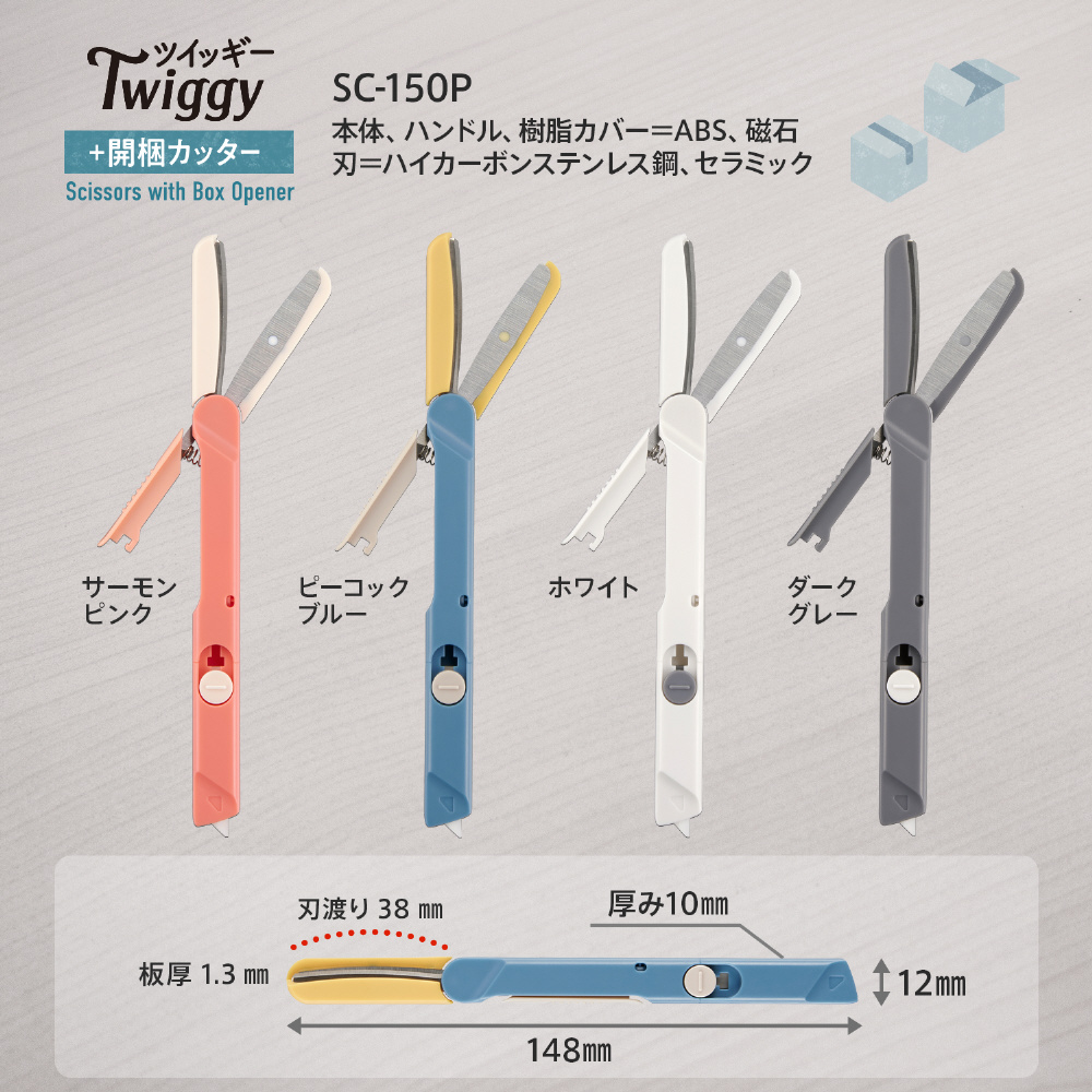 「フィットカットカーブ ツイッギー+開梱カッター」は、家庭用はさみのブランド「フィットカットカーブ」シリーズから誕生した「フィットカットカーブ ツイッギー」に、セラミック製の開梱カッターをプラス。はさみとカッターそれぞれの特性を生かして開梱・開封のあらゆるシーンに1本で対応し、梱包テープや封筒、袋、タグ、PPバンド、フィルムなどさまざまな素材をスムーズに切ることができます。