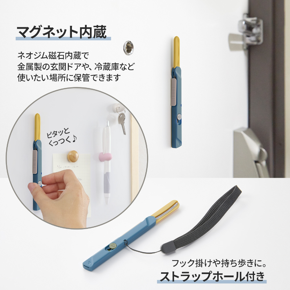 はさみ部分は、ベルヌーイカーブ刃によるサクサクとした快適な切れ味はそのままに、更にキャップレス仕様でさっと使える手軽さと、樹脂カバーやセーフティロックによる安全性を両立。セラミック製の開梱カッターは、段ボールの厚さに合わせた長さで、荷物の中身を傷つけにくい設計です。またネオジム磁石を内蔵し、玄関ドアや冷蔵庫などに付けて保管ができます。