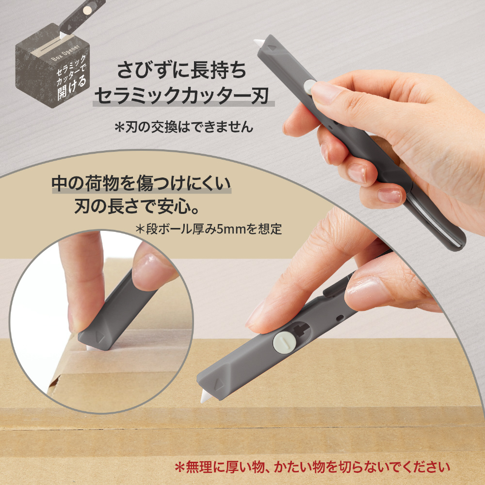 はさみ部分は、ベルヌーイカーブ刃によるサクサクとした快適な切れ味はそのままに、更にキャップレス仕様でさっと使える手軽さと、樹脂カバーやセーフティロックによる安全性を両立。セラミック製の開梱カッターは、段ボールの厚さに合わせた長さで、荷物の中身を傷つけにくい設計です。またネオジム磁石を内蔵し、玄関ドアや冷蔵庫などに付けて保管ができます。