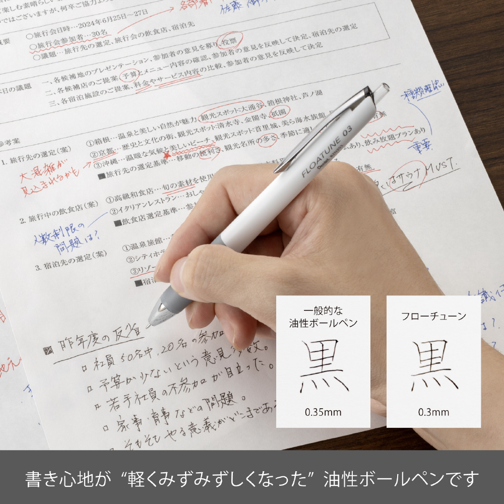 フローチューンは、油性でありながらゲルのような書き心地の良さも兼ね備えた新感覚「摩擦レス」の新油性ボールペンです。軽い筆記感と心地よさを追求した新開発の油性インキボールペンです。・筆記時の摩擦を極限まで軽減した、摩擦レスボールペン・クッション性の高いスムーズなインキ・ストレスのない書きごこちを体現した、ノイズレスなデザイン。