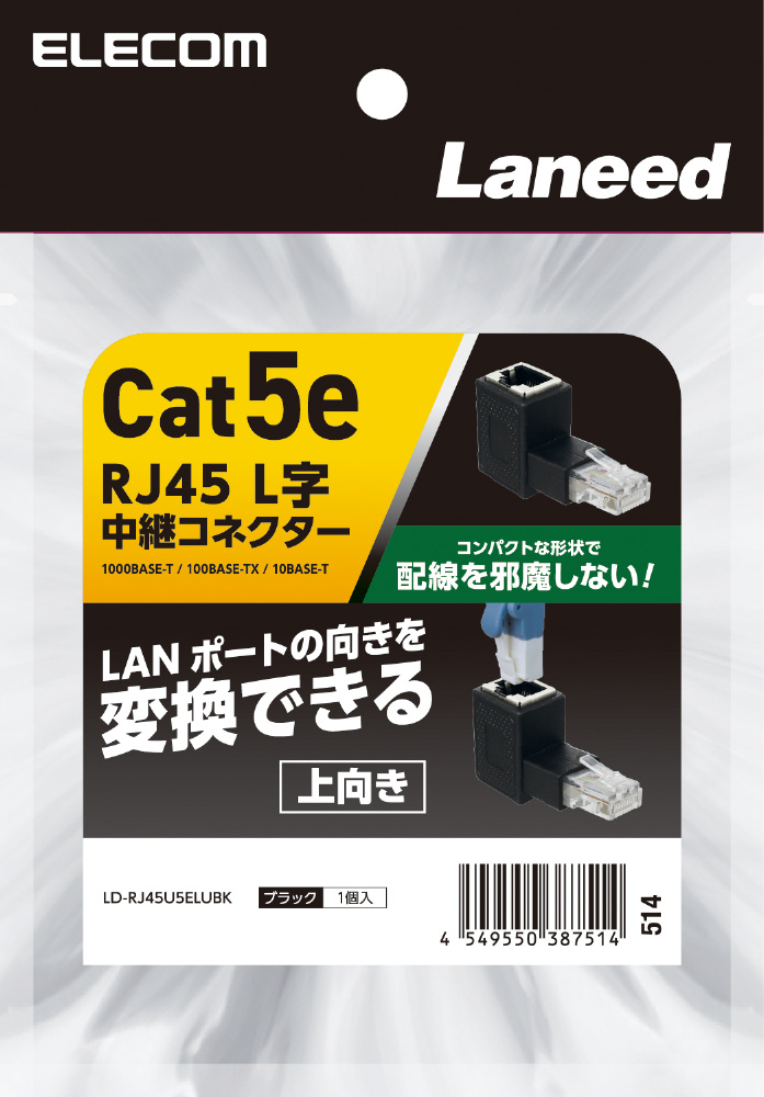 機器への接続時、上向きにケーブルを出すことができる、RJ45 L字変換コネクターです。