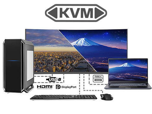 KVM機能に対応。モニターに接続したキーボード、マウスをデスクトップPCやUSB-C接続のノートPCで入力を切り替えた際にもそのまま使用可能です。