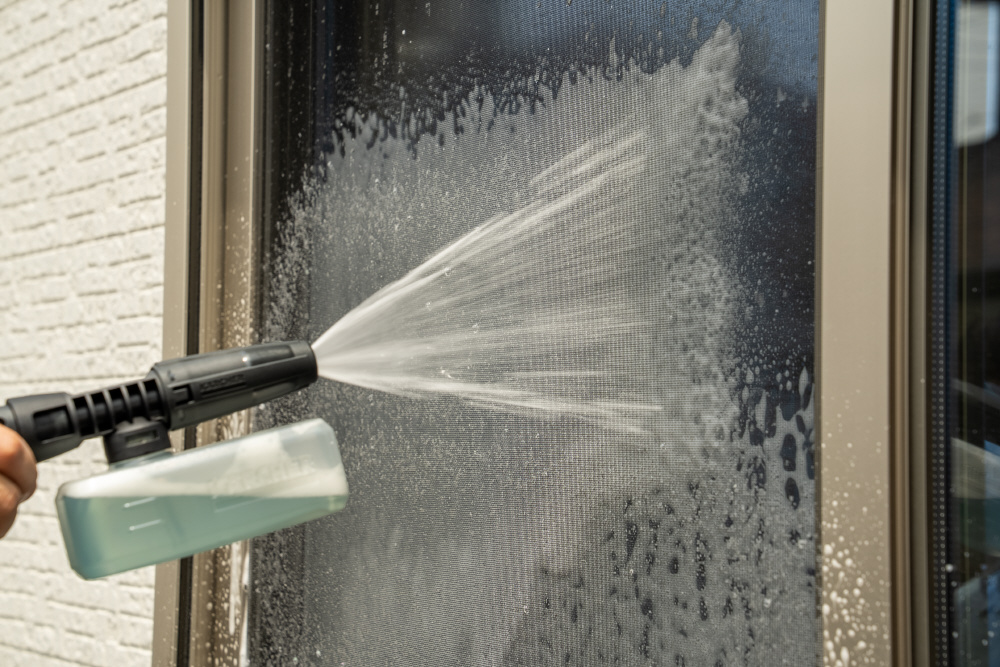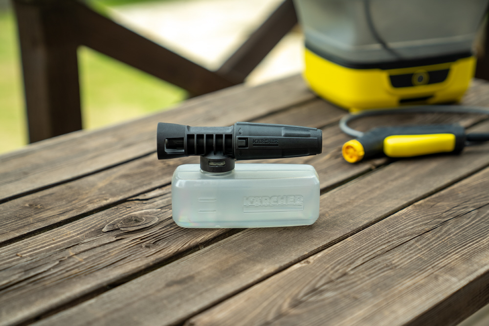 フォームジェットはトリガーガンに直接取り付けられ、洗剤を注ぐだけで使用できます。