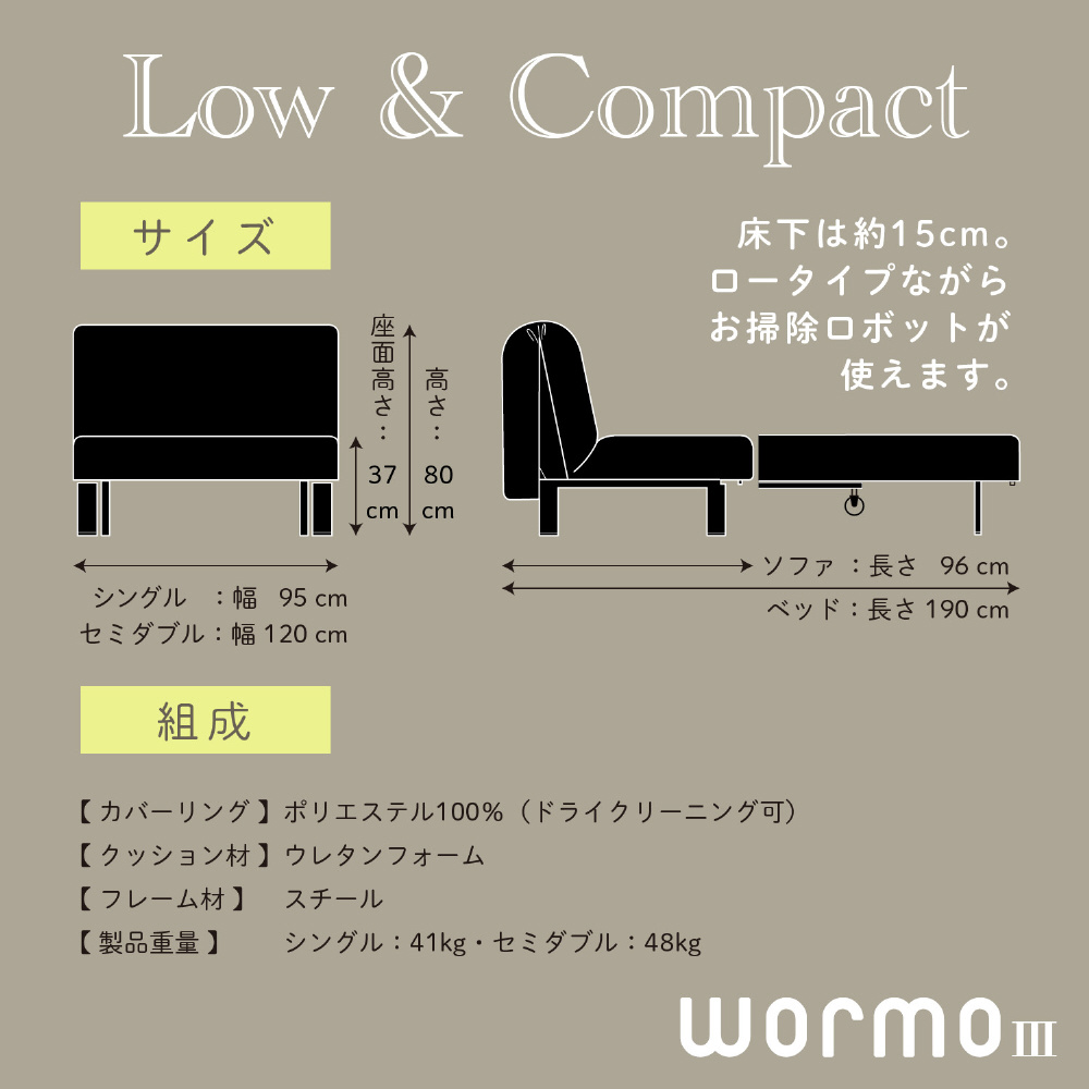 「ワーモ」は、高品質なマットレススプリングを採用した快適なソファーベッド。スタイリッシュ且つ実用的なデザインが特徴です。日常使いはもちろん、来客対応としても活躍する便利でお洒落なアイテムです。