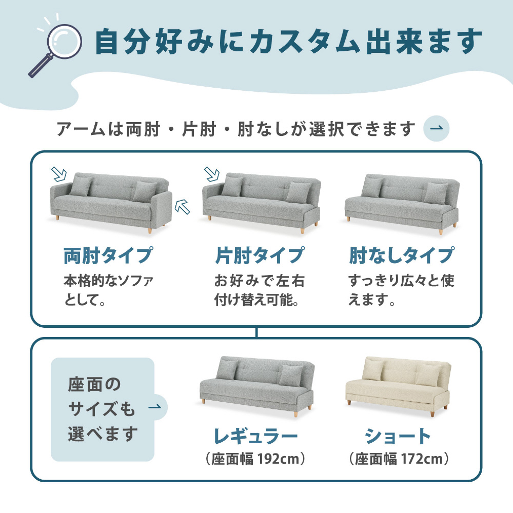両肘・片肘・肘なし。アームの仕様が選択できる収納付きソファベッド