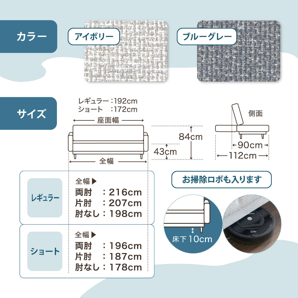 レギュラー 幅198×奥行90(ベッド時112)×高さ84×座面高さ44cm