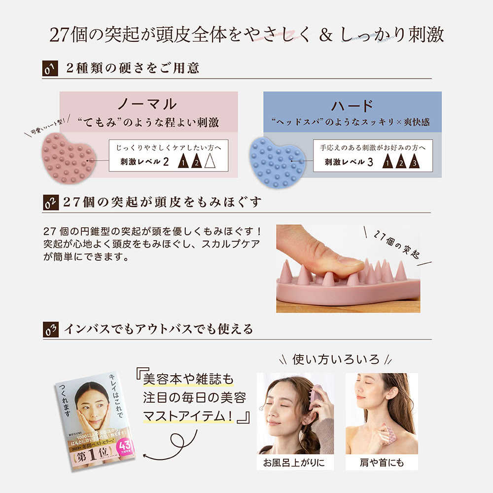 27個の円錐型の突起が頭を優しくもみほぐす!突起が心地よく頭皮をもみほぐし、スカルプケアが簡単にできます。