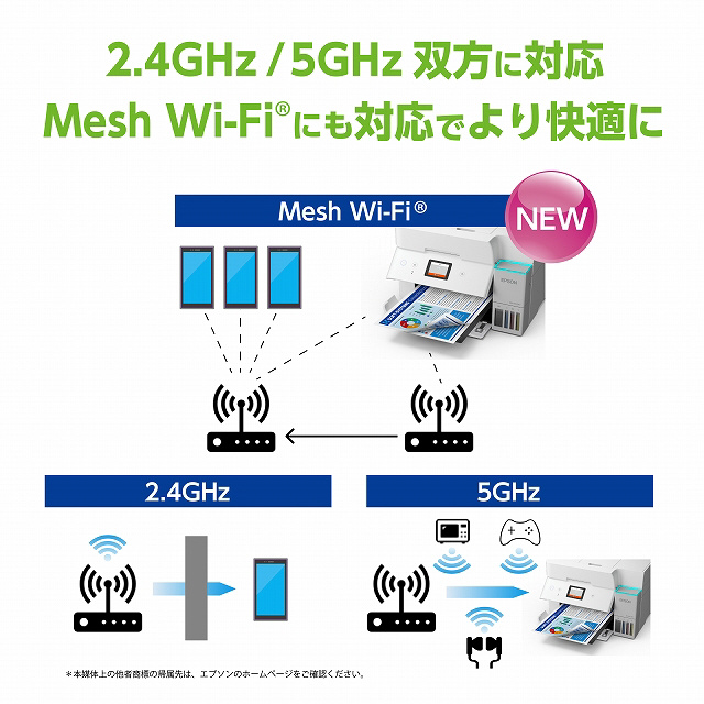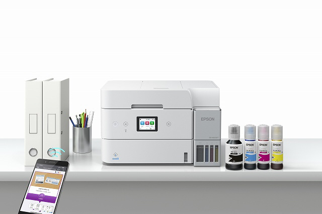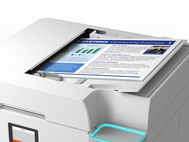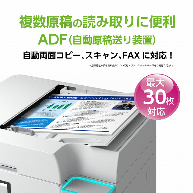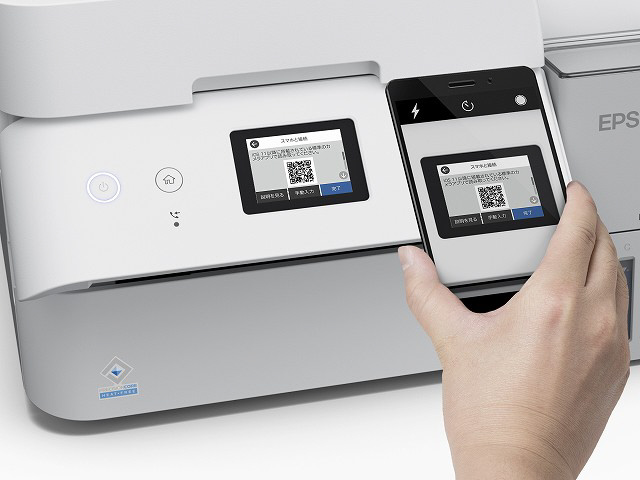 QRコードを読み込むだけでスマホとの接続が可能に。さらにスマホ・タブレット専用アプリ「Epson Smart Panel」を使うことでスマホからプリンターの操作も可能になります。コンパクトボディで、普通紙を最大250枚セットできる給紙カセットやインク補充、残量確認も前面操作でできるので省スペースに貢献します。さらにADF(オートドキュメントフィーダー)やファクスを搭載。自動両面印刷、有線/無線LANにも対応しています。