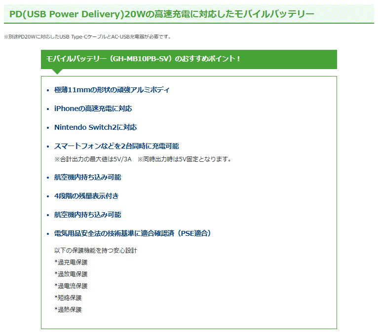 PD(USB Power Delivery)20Wの高速充電に対応したモバイルバッテリー