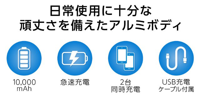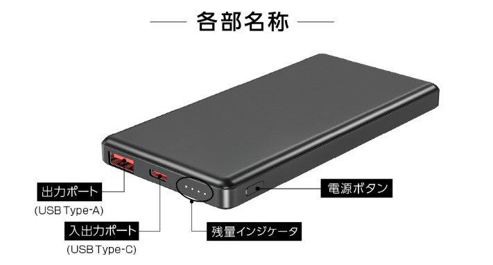 仕様3 【対応機器】 USBポートを利用して充電できる機器 Androidスマートフォン、iPhoneシリーズ、iPad、タブレット、携帯型ゲーム機、デジタルオーディオプレーヤー、パソコン周辺機器、モバイルルーター、電子タバコなど ※対応機器の仕様や性能により、一部機器で充電できない場合があります。 ※機器によっては、別途充電用のケーブルが必要になる場合があります。