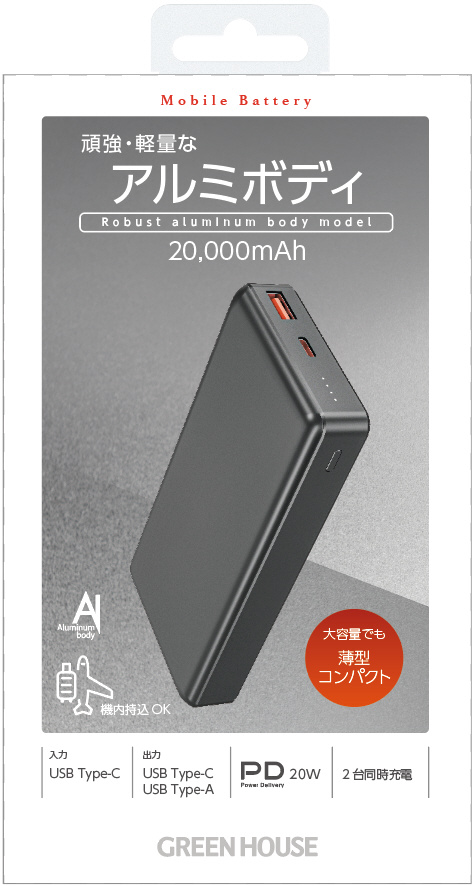 アルミ モバイルバッテリー PD20W 20000mAh シルバー GH-MB20PB-SV [USB Power Delivery対応 /2ポート]