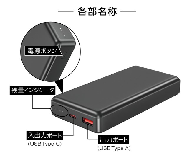 PD(USB Power Delivery)20Wの高速充電に対応したモバイルバッテリー