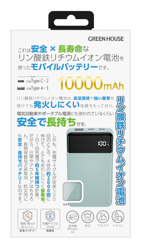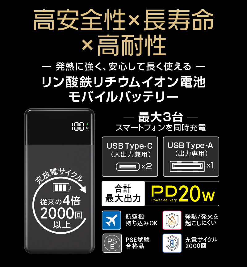 高い安全性と長寿命を備えたリン酸鉄リチウムイオン電池を採用したモバイルバッテリー