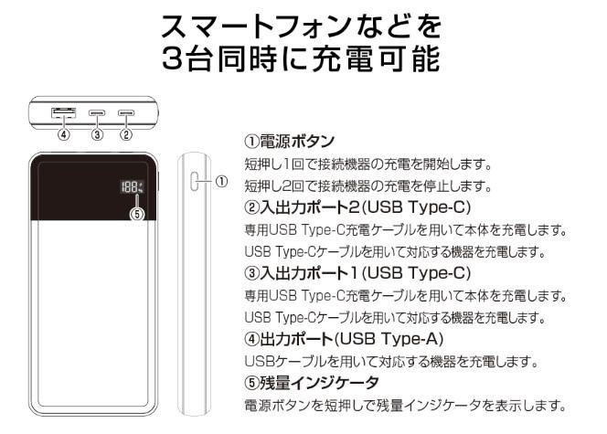 ■スマートフォンなどを3台同時(Type-C×2、Type-A×1)に充電可能
