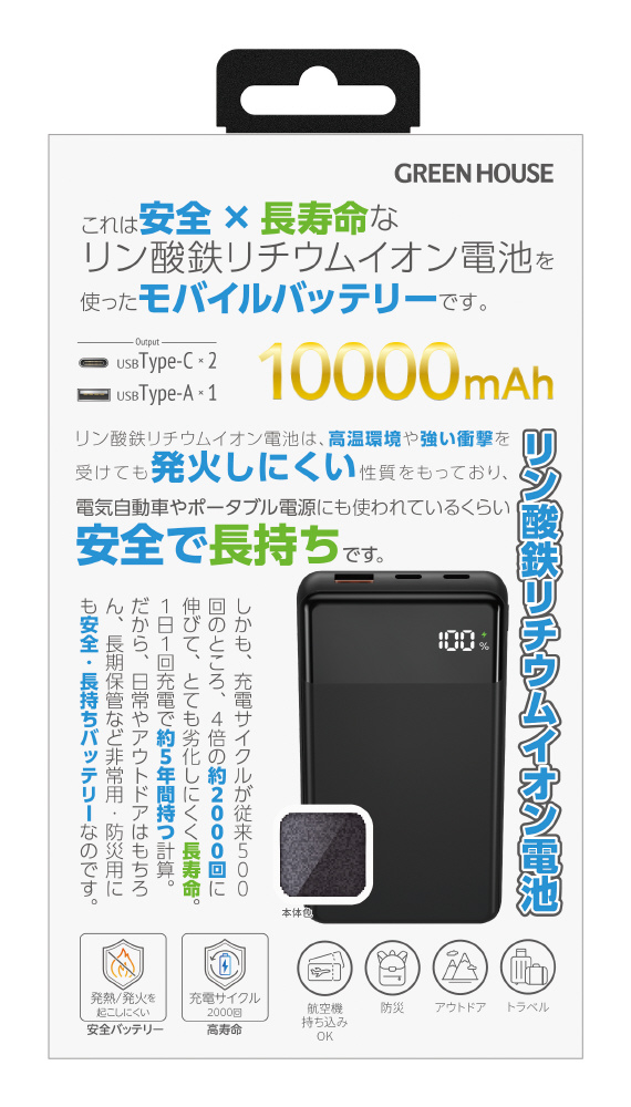 リン酸鉄 モバイルバッテリー 10000mAh PD20W ブラック GH-LFMBPA100-BK [USB Power Delivery対応 /3ポート]