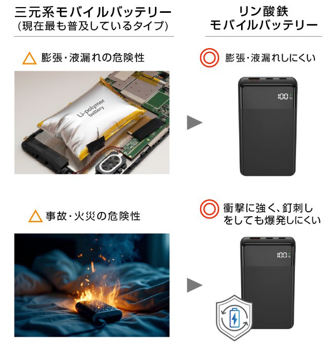 不安定で発熱・発火のおそれがある従来のモバイルバッテリーより、電気自動車などに採用されているリン酸鉄リチウムイオン電池は発熱・発火・衝撃に対する強い耐性があり、従来品を大きく超える安全性を誇ります。