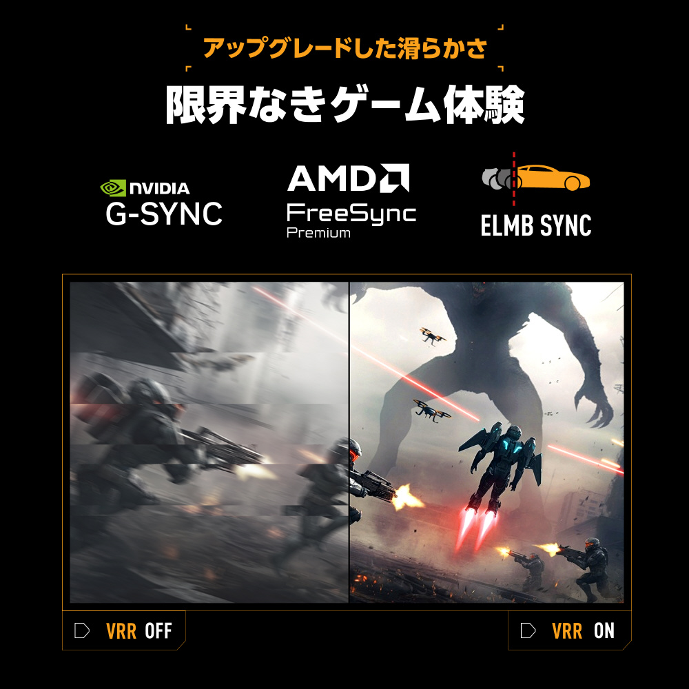 NVIDIA G-SYNCおよびAMD FreeSync Premium対応で、滑らかでティアリングのない映像を実現。さらに、ASUS ELMB Syncが高フレームレートゲーム中のゴーストを排除します。