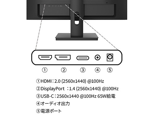■インターフェイスはHDMI 2.0 x1 (100Hz)とDisplayPort 1.4 x1 (100Hz)、さらにUSB-C x1 (100Hz/最大65W給電)を装備し、様々な機器との接続が可能です。USB-C(最大65W給電)は、対応のPCであればUSB-Cケーブル1本でモニターへの映像出力とノートPCへの給電が可能。ケーブル1本でスッキリ接続出来るだけでなく、テレワーク、出社併用の場合などノートPCのACアダプターを持ち運ぶ必要が無くなります。