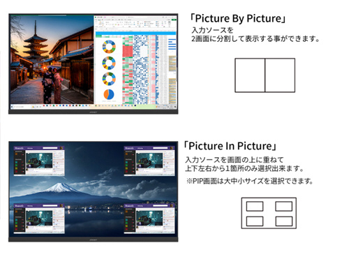 ■複数の入力映像を同時に表示するPIP(Picture In Picture)とPBP(Picture By Picture)に対応、PIPではもう一つの入力画面を子画面(左上/右上/左下/右下から選択)で同時表示が可能。PBPでは2つの入力を左右に同時表示することが可能です。