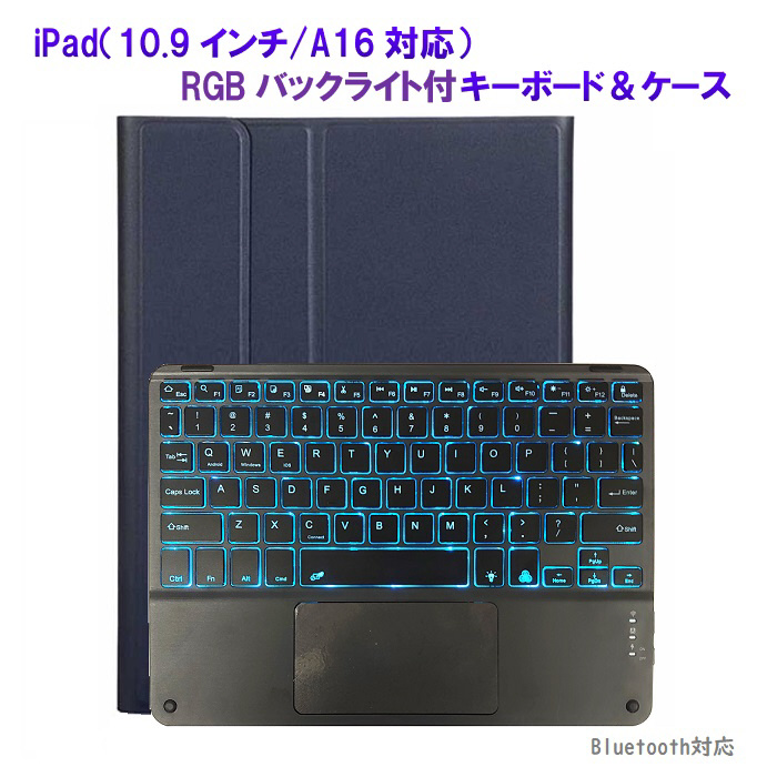 11インチ iPad(A16)、10.9インチ iPad(第10世代)用 キーボード(かな無し)&ケース(ブラックキーボード) RGBバックライト付 ネイビー RM-2221-109NB
