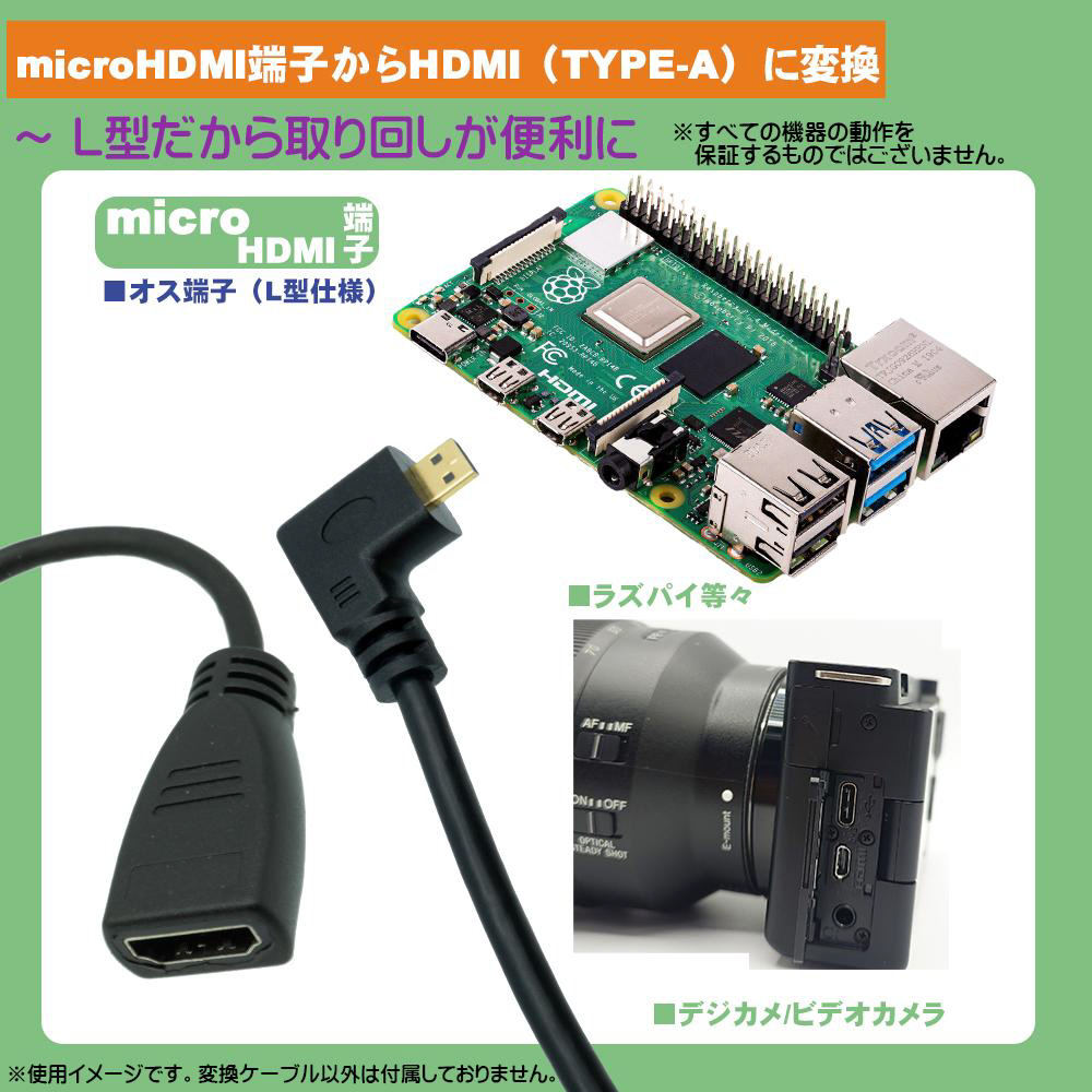 microHDMIを通常のHDMIに変換することでデジカメ、ビデオカメラ、ラズパイ等のmicroHDMI搭載機器を