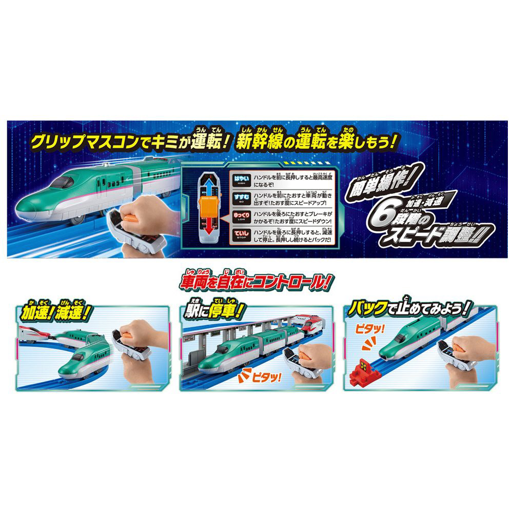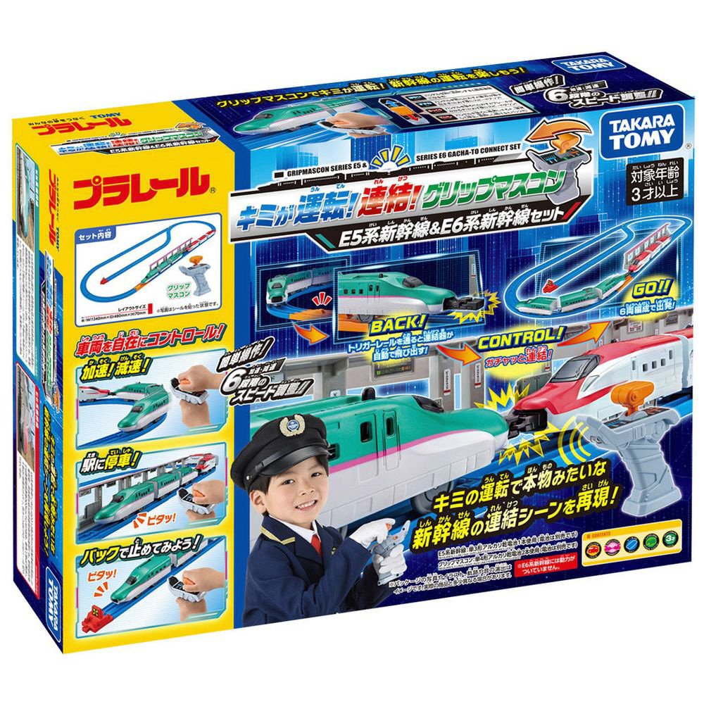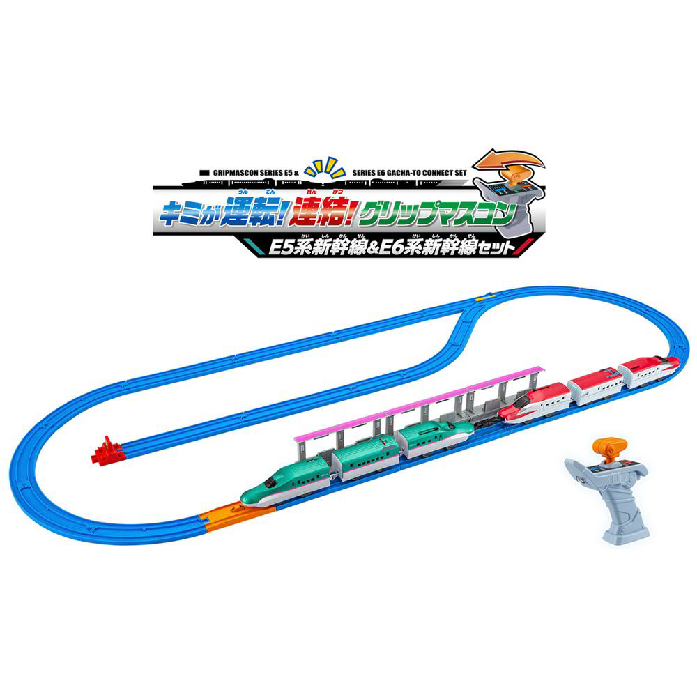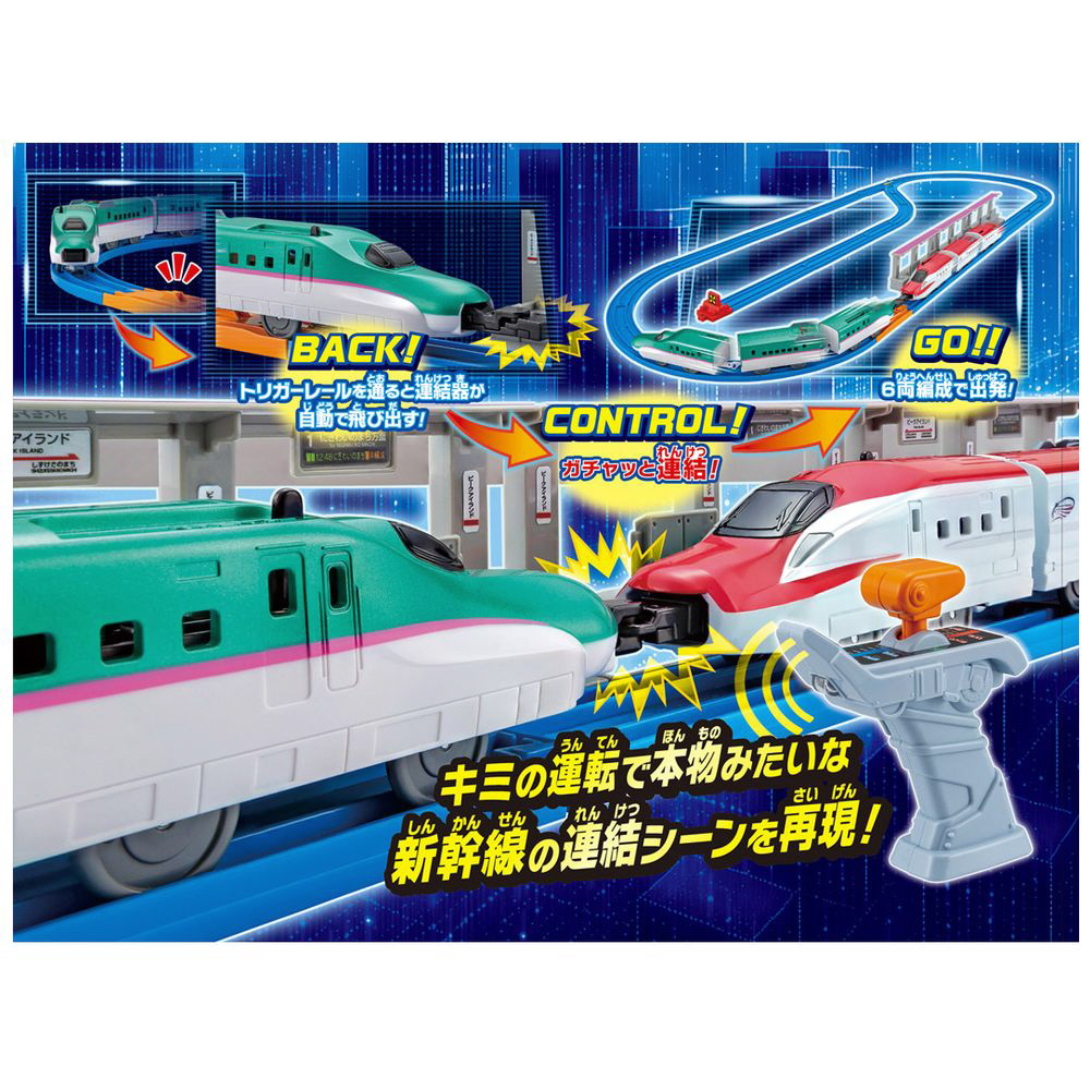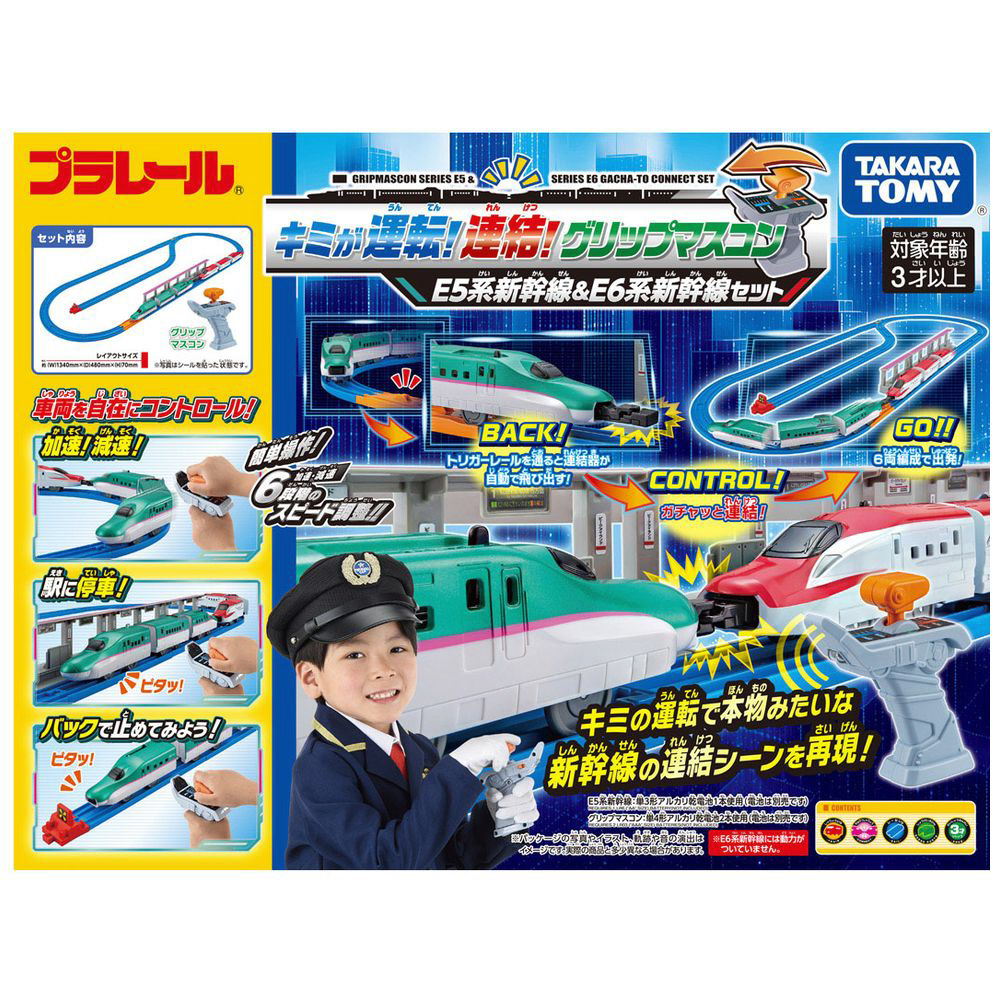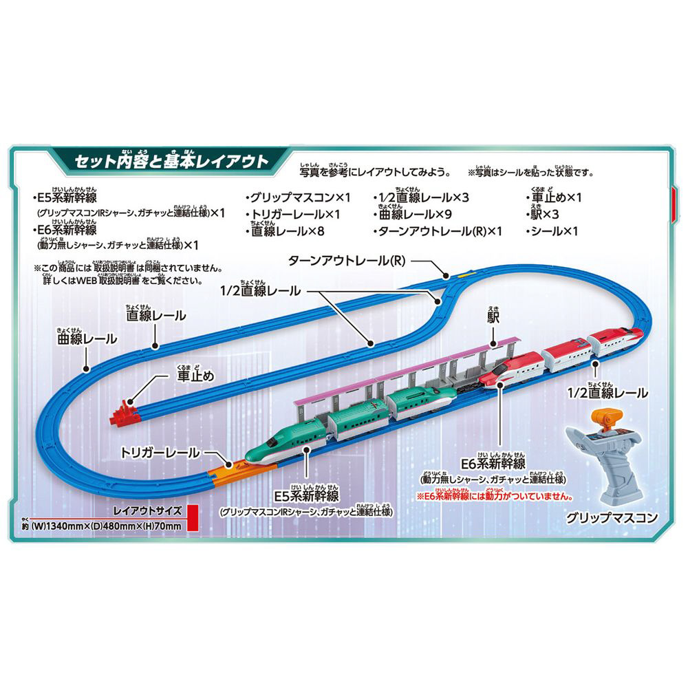 ■E5系新幹線はやぶさ車両(グリップマスコンIRシャーシ、ガチャッと連結仕様)とE6系新幹線こまち(動力なしシャーシ、ガチャッと連結仕様)が付属。
