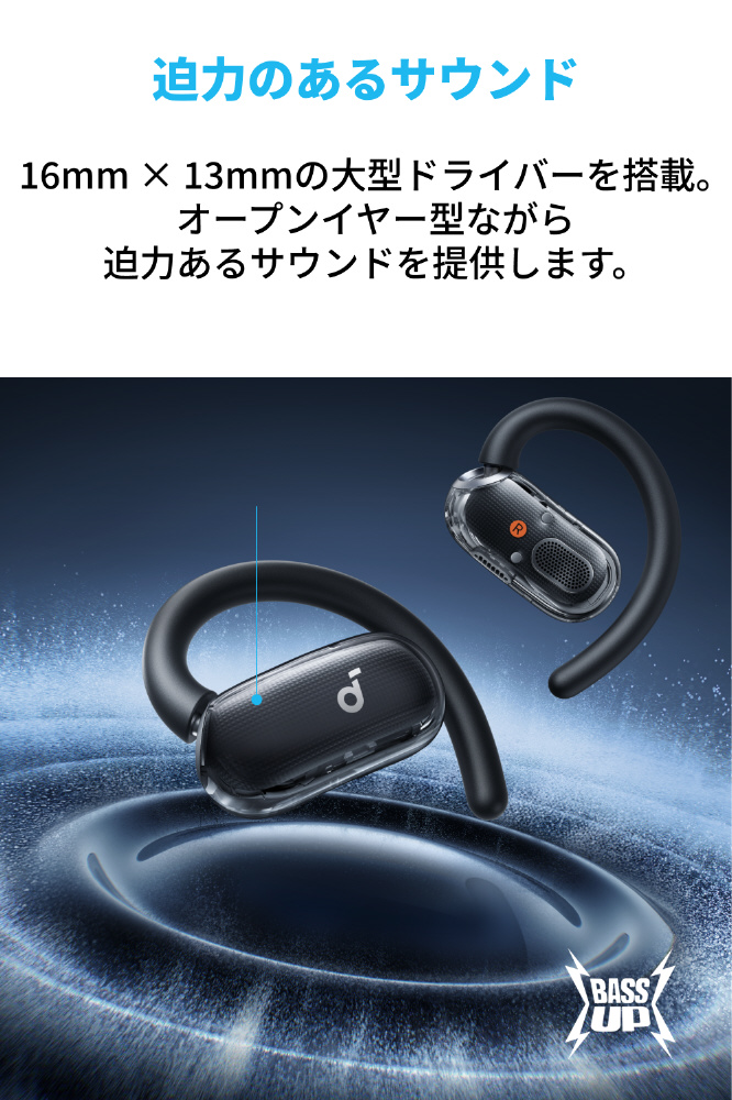 16mm x 13mmの大型ドライバーを搭載、オープンイヤー型ながら迫力あるサウンドを提供します。