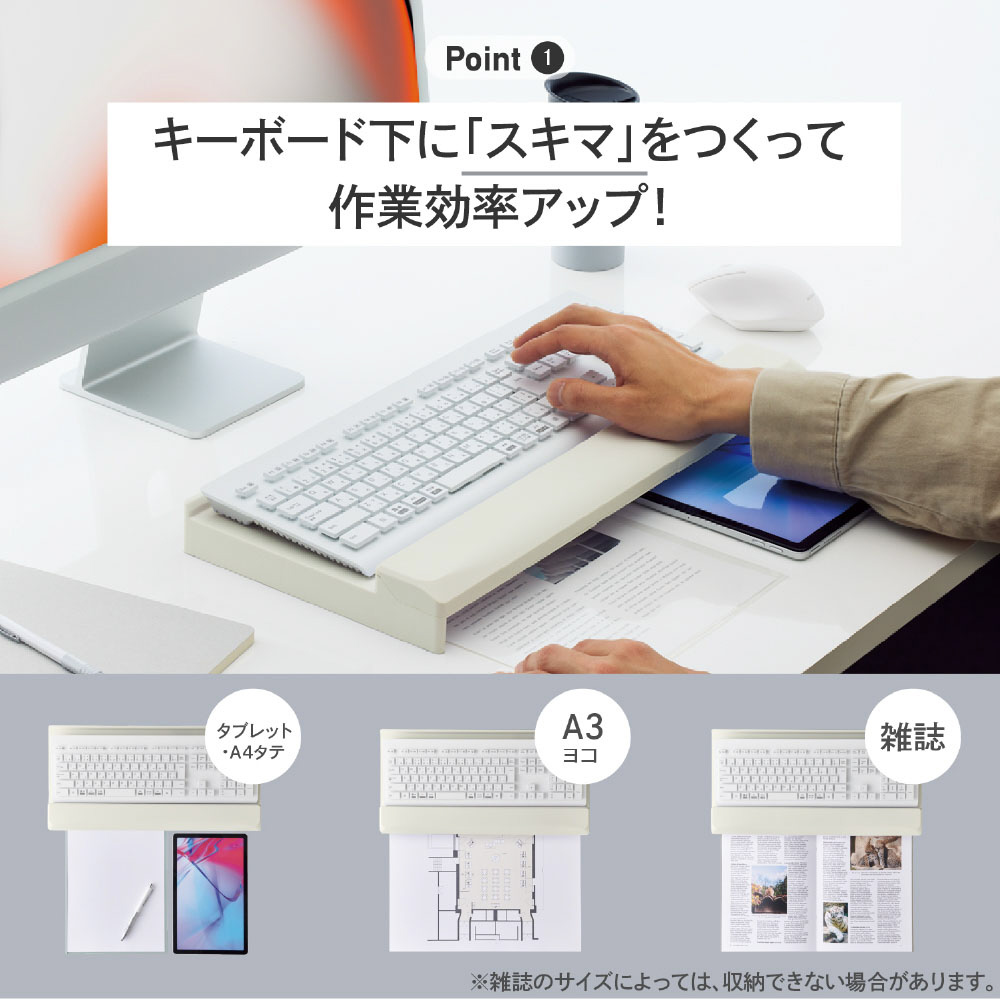 本体にキーボードを置くことで、キーボード下のスペースに書類などが入り、狭いデスクでも作業効率がアップします。
