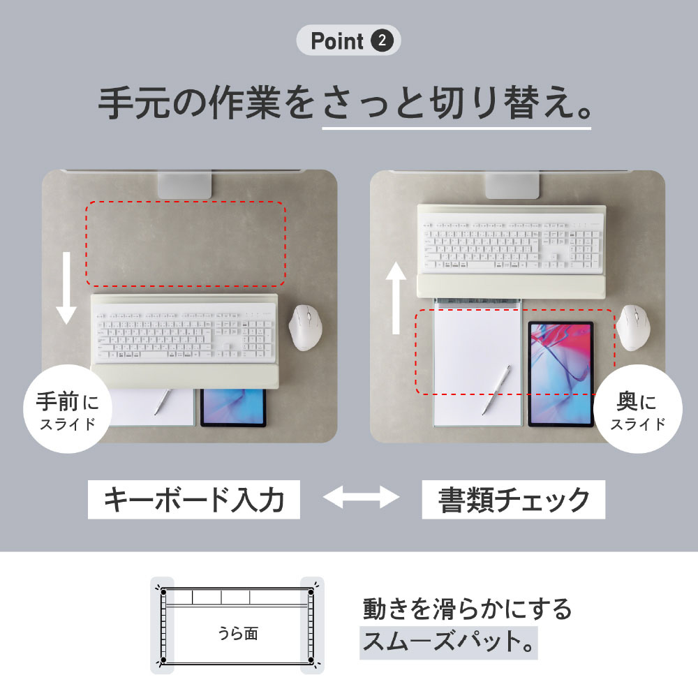 ■本体の両脚に付いている「スムーズパッド」で、すっと本体を動かせるのでキーボード入力と書類などの確認をスムーズにできます。