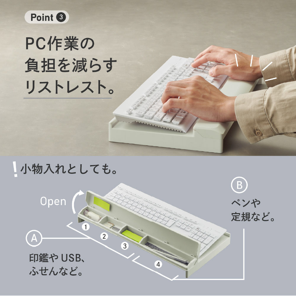 ■手首が疲れにくいリストレスト付きで、リストレストには文具などが入る小物入れが付いています。