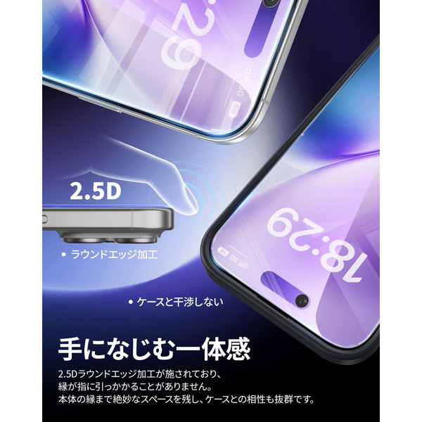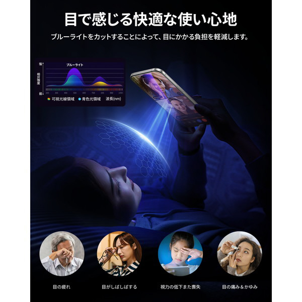 ケースに干渉しないブルーライトカットガラスフィルム。レンズフィルム付き。カンタン貼付け用ガイド枠同梱で、苦手な方でも手軽にフィルムを貼り付けられます。目に優しいブルーライトカット加工により、目にかかる負担を軽減します。