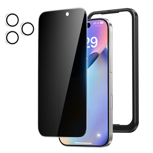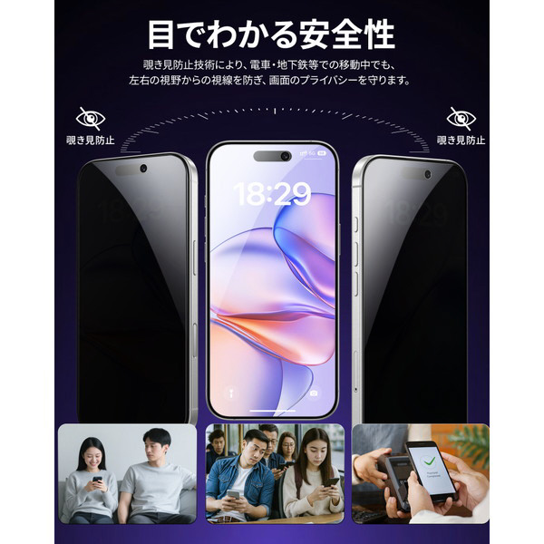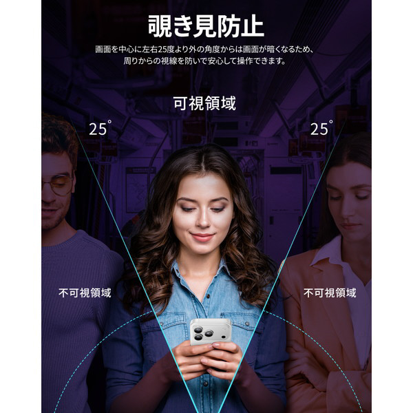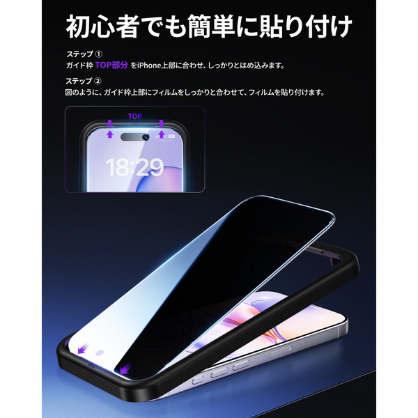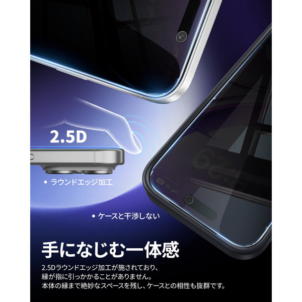 ケースに干渉しないのぞき見防止ガラスフィルム。レンズフィルム付き。カンタン貼付け用ガイド枠同梱で、苦手な方でも手軽にフィルムを貼り付けられます。のぞき見防止加工により左右180度からの視線をブロック、プライバシーを保護します。