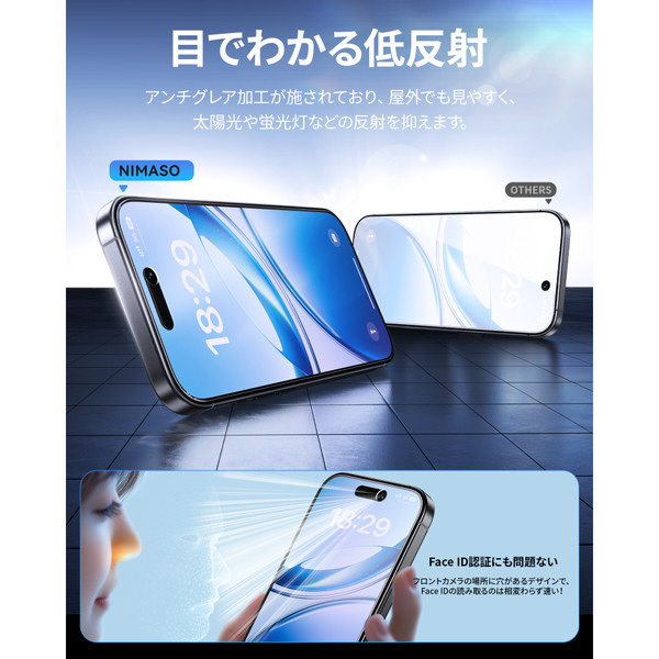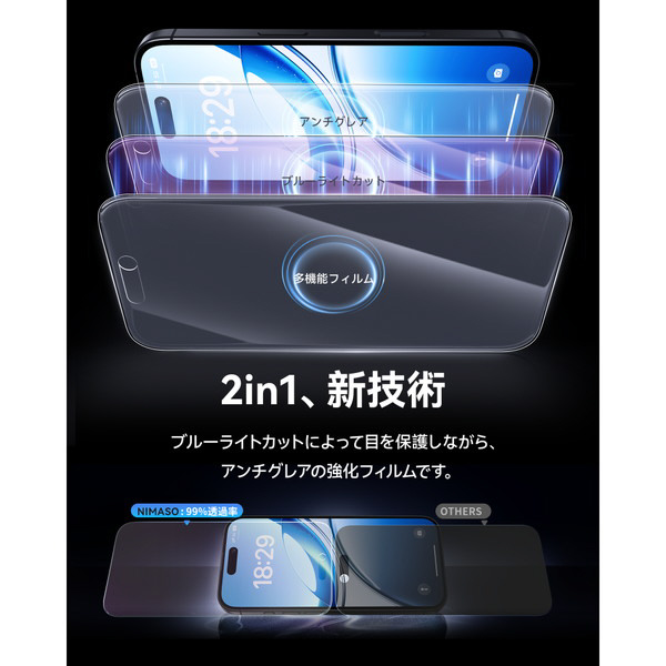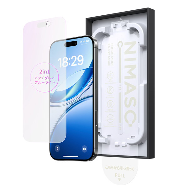 ケースに干渉しない反射防止(アンチグレア、ブルーライトカット)ガラスフィルム。反射防止機能とブルーライトカットが一つになった指触りがサラサラなガラスフィルムです。NIMASO独自のガイドBox「バリ楽」採用。パッケージと一体化した「バリ楽Box」で今まで以上に貼付けがカンタンになりました。フィルムがセットされているバリ楽BoxにiPhoneを被せてシートを引っ張るだけで確実にフィルムを貼付けられます。