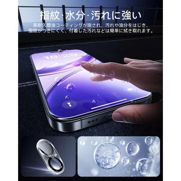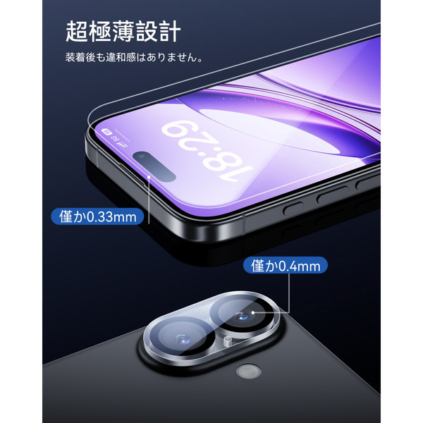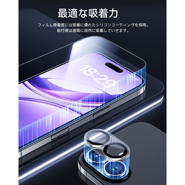 極薄の専用設計でしっかりとカメラレンズを保護するフィルムも同梱。指紋や汚れが付着しにくいコーティングで写真の美しさを損ないません。