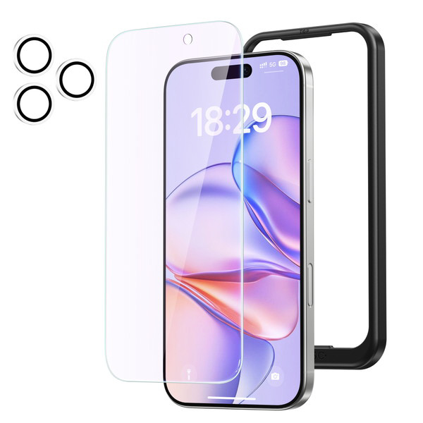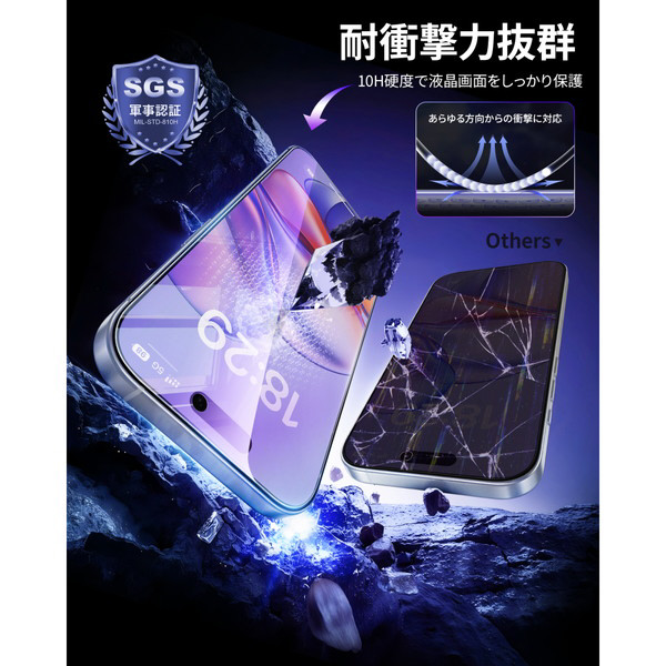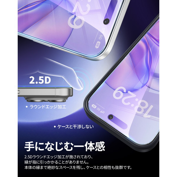 ケースに干渉しないブルーライトカットガラスフィルム。レンズフィルム付き。カンタン貼付け用ガイド枠同梱で、苦手な方でも手軽にフィルムを貼り付けられます。目に優しいブルーライトカット加工により、目にかかる負担を軽減します。