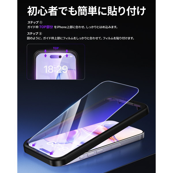 iPhoneの形状にピッタリとフィットするガイド枠に沿って、苦手な方でも確実にフィルムを貼り付けられます。貼付け前のクリーニングに便利なクロスやホコリ取りシールも付属しています。