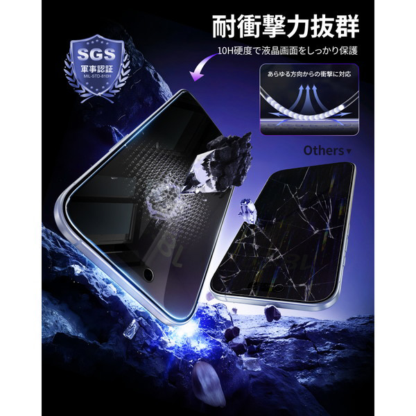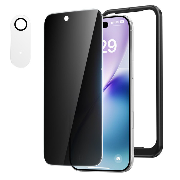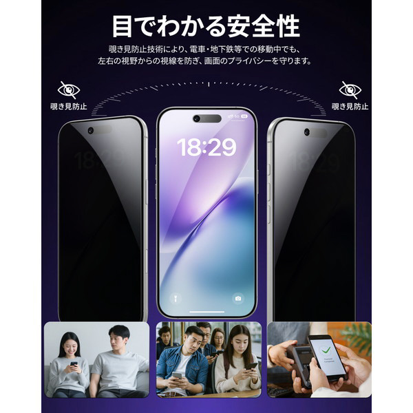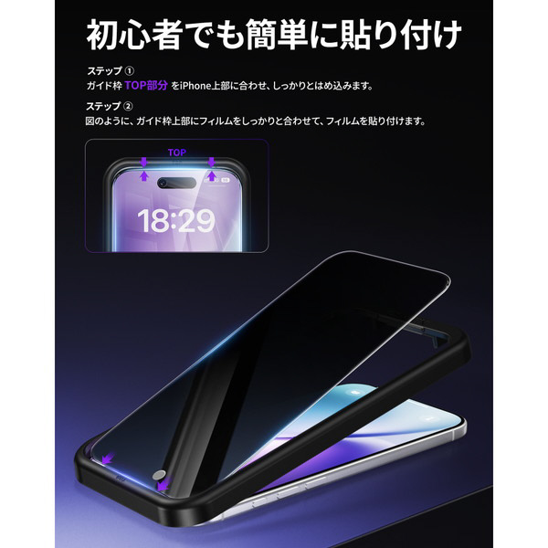 ケースに干渉しないのぞき見防止ガラスフィルム。レンズフィルム付き。カンタン貼付け用ガイド枠同梱で、苦手な方でも手軽にフィルムを貼り付けられます。のぞき見防止加工により左右180度からの視線をブロック、プライバシーを保護します。